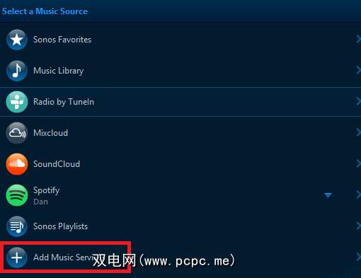 查看应用程序的主屏幕后,找到窗口右侧的选择音乐来源面板。在这里,您将看到所有现有服务。在列表底部,单击添加音乐服务。