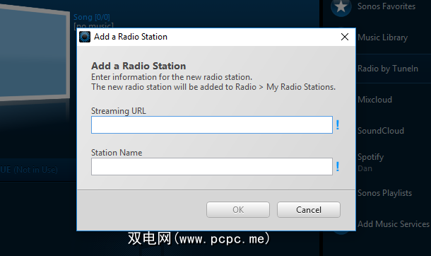 一旦广播的URL,启动Sonos应用并导航至管理>添加广播电台。在流URL 框中输入URL,并为电台命名。准备就绪后,单击确定。