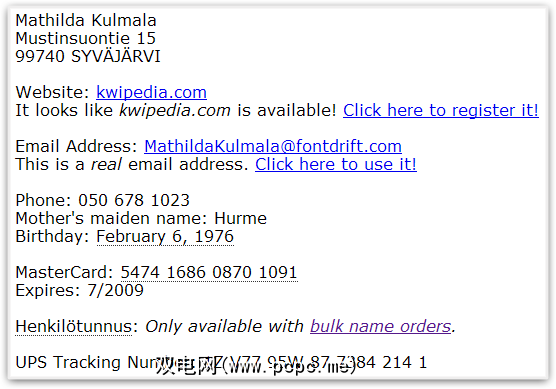 假名生成器。但是,它比仅仅给您一个假名要走得更远。该网站可以根据您选择的国籍生成姓名,为您提供所选国家/地区的地址,为您的“假冒自己"提供一个网站,一个电子邮件地址,一个电话号码,母亲的娘家姓,一个信用卡号(带有过期日期),甚至是社会保险号。酷还是什么?