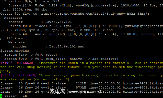raspivid -o - -t 0 -vf -hf -fps 30 -b 6000000 | avconv -re -ar 44100 -ac 2 -acodec pcm_s16le -f s16le -ac 2 -i /dev/zero -f h264 -i - -vcodec copy -acodec aac -ab 128k -g 50 -strict experimental -f flv rtmp://a.rtmp.youtube.com/live2/[your-secret-key-here]如您所见,它有很多元素。现在,如果要继续运行它,然后复制代码,将其粘贴到终端窗口中,然后按Enter。记住,要更改您之前记下的Stream键的 [此处为您的机密键] 。