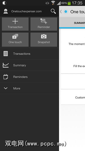 One Touch Expenser是Holo应用程序,它使用侧边栏进行导航。打开侧边栏,找到四种记帐方式: