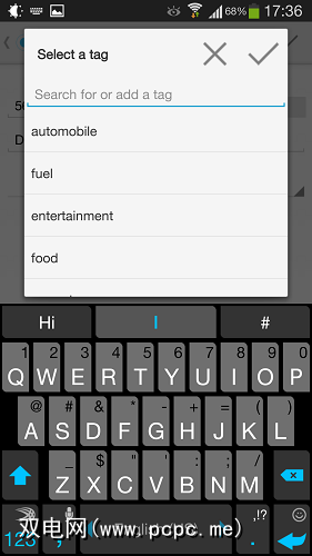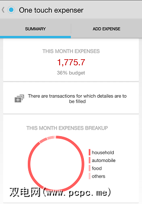 它还向您显示了到目前为止的支出明细。配色方案可以做一些改进(虽然对色盲不友好),但是表示很简单。您看到的类别(家庭,汽车,食物)实际上是标签。这些是可选的,但可以快速申请任何费用: