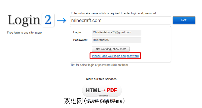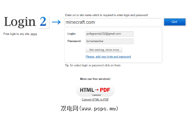 要使用Login2.me,访问该网站并输入您想要帐户的URL。当您单击获取时,Login2.me将遍历其数据库并显示其可以找到的所有帐户。然后,将用户名和密码复制并粘贴到登录字段中。