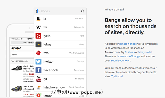 他们执行此操作的主要方式是使用 Bangs ,这是一种易混淆的命名工具,使您可以从DuckDuckGo中快速搜索其他网站。