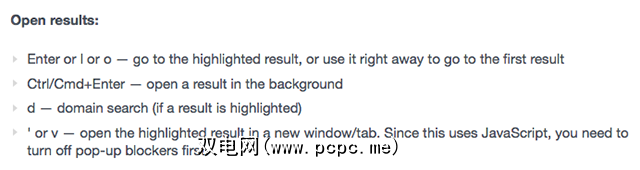 您可以使用键盘完全浏览DuckDuckGo的搜索结果:只需使用箭头键在结果之间切换,然后按 Enter 即可打开页面。您甚至可以按 CTL或CMD Enter 在后台的新选项卡中打开结果。