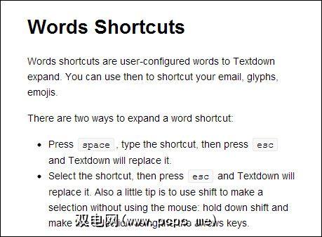 为使工作效率更高,Textdown还允许您使用单词快捷键。 Word快捷键的功能就像文本扩展器一样;使用一些字符替换文档中的常用表达式。