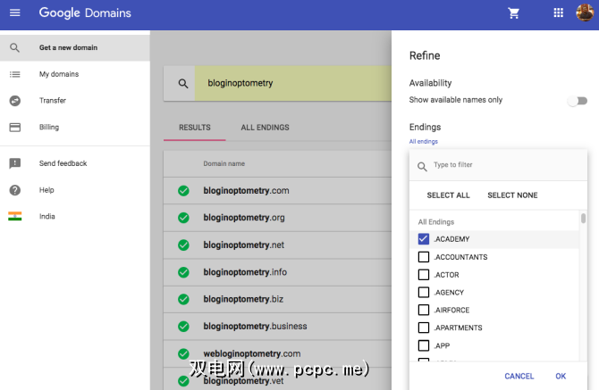 搜索域时,Google Domains会自动搜索带有多个域后缀的该域(例如,.com,.net ,.org)。点击过滤域按钮以进一步优化搜索。