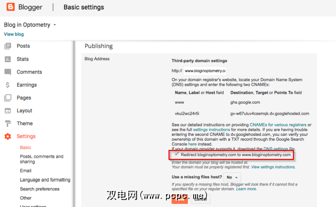 选中显示将mydomain.com重定向到www.mydomain.com 。点击保存。然后,Google将负责重定向部分,如果有人打开您的Blogspot地址,他们将自动重定向到您的新自定义域名。