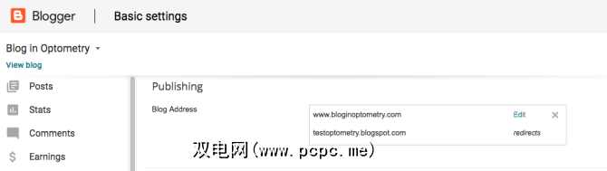 要将域名(例如:bloginoptometry.com)更改为www.bloginoptometry.com,请设置重定向。在发布>博客地址下,单击编辑。