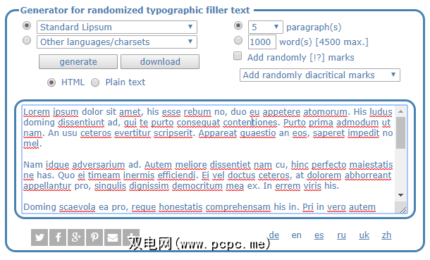 该网站为您提供了更多生成lorem ipsum文本的选项;如果您想用其他语言生成相似的文本,则特别有用。选择其他语言/字符集框,以更改为各种脚本,甚至某些人工语言。除此之外,设置段落数或字数限制,然后单击生成或下载。