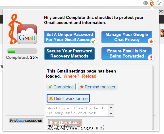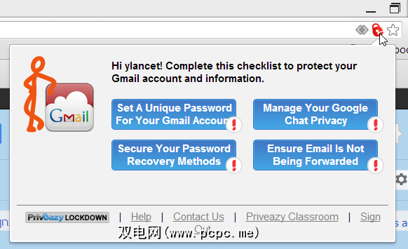 在安装完扩展名,每次您登录Priveazy支持的站点时,地址栏中都会出现一个红色的锁定图标。单击它可以找到一些基本任务,必须完成这些任务以确保您的隐私受到保护。