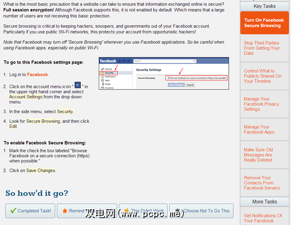 这些不只是提示。单击任务将自动加载相关的设置页面,以及有关如何更改特定设置的详细说明。完成更改后,将此任务标记为完成。完成所有任务后,红色锁定图标将变为绿色,并且您会知道自己的隐私和在此特定网站上一样安全。另外,您可以设置提醒以稍后执行此任务,尽管您需要为此在Priveazy上创建一个帐户。