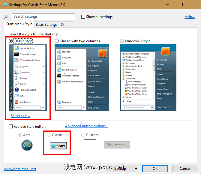 另一个难题是要恢复经典的Windows 9x“开始"菜单。为此,您可以使用多功能的经典外壳。安装它,即可直接从其设置恢复旧的单列经典样式“开始"菜单。您还可以应用经典开始按钮来完成外观。