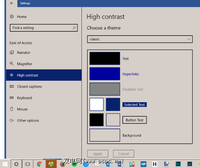 C:\Windows\Resources\Ease of Access Themes下一步,打开 Settings 应用并转到 Easy Access>高对比度强>。 Windows在此处收集辅助功能主题。在下拉菜单中单击时,您应该看到提取的经典条目。选择它并点击应用以在Windows 98绘画中涂覆Windows 10。请注意,这最终会使Windows看起来很难看。