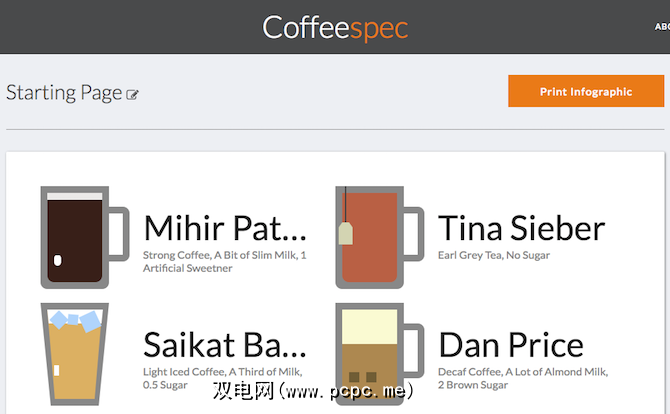 Coffee Spec是一种免费工具,可用来制作有关您(以及其他人的)理想杯子的信息图。它非常适合团队或您的家,让每个人的喜好都容易记住。