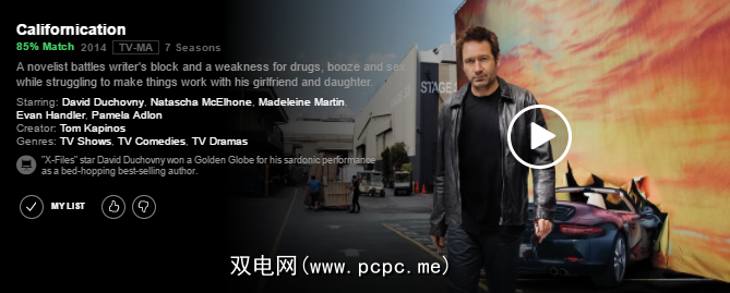 《加里福尼克》的全部七个季节和84集都可以在Netflix上找到。情节通常长达半小时。影片在放映期间获得了两次艾美奖摄影奖,以及杜乔夫尼(Duchovny)提到的金球奖。