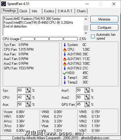 默认风扇配置可能会导致过热。您的风扇运行速度可能太慢,无法真正冷却PC部件。有些GPU显示高温,因为GPU驱动程序软件仅在特定负载范围内激活GPU的风扇。那是您应该控制风扇速度的时候。诸如SpeedFan之类的程序仅提供此服务。