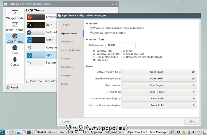 LXQt吸引人的部分原因是缺少依赖项(必须安装后台服务才能运行程序)和使用可互换的组件。例如,LXQt使用Openbox窗口管理器。您可以使用任何与Openbox兼容的主题来更改窗口标题栏的外观。您还可以调整标题栏中的按钮顺序以及出现的按钮。