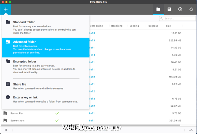 要同步文件夹,请点击加按钮,然后选择标准下拉菜单中的strong>或高级文件夹。尽管它们看起来相同,但是请参见Resilio的帮助页面。