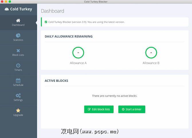 Cold Turkey提供了多种工具,可帮助您更集中。其中包括阻止调度程序,网站的每日津贴,您的使用情况统计信息以及用于保护设置的密码。