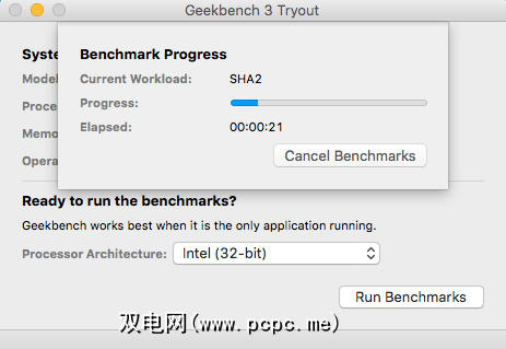 打开Geekbench时,会出现一个小屏幕,提示您选择处理器体系结构。如果不确定,则所有2007年及更新版本的Mac都是64位的。做出选择并点击运行基准后,测试将开始。