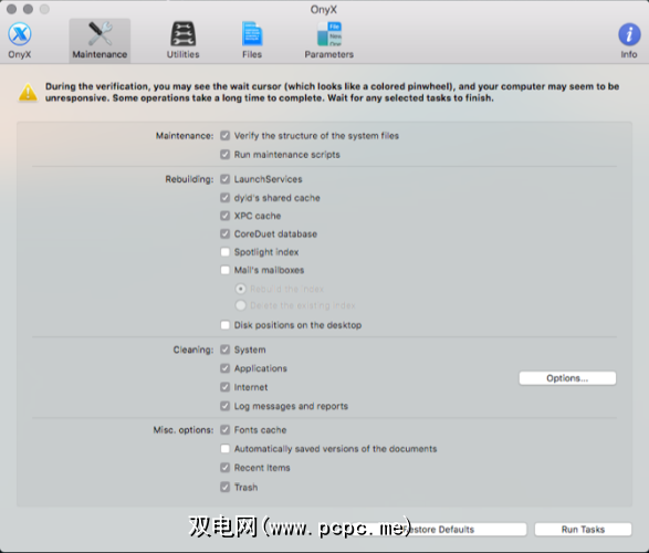 OnyX是OS X诞生以来的免费实用程序应用程序。该界面有四个窗格:维护,实用工具,文件和参数。每个选项都细分为多个视图。