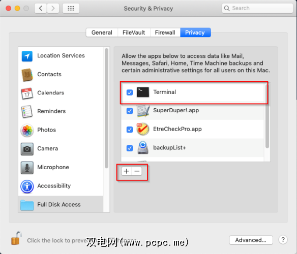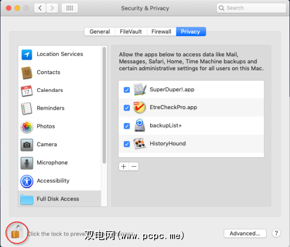 chflags -R nouchg ~diskutil resetUserPermissions / `id -u`Mojave和更高版本的步骤与上述步骤相同,但是在继续操作之前,必须将Terminal添加到 Full Disk Access 。为此,请转到系统偏好设置>安全和隐私,然后点击隐私标签。点击锁定图标,然后输入管理员密码进行更改。