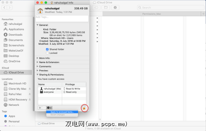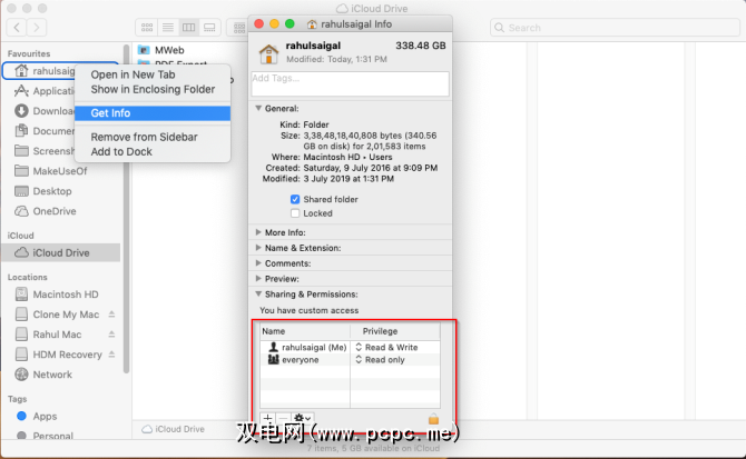 从Finder边栏中,右键单击主文件夹,然后选择获取信息。单击共享和权限下拉三角形以查看其权限。
