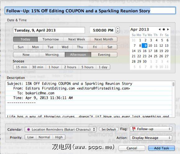 流行的Mailbox应用iPhone的iPhone具有方便的功能,可将提醒附加到各个消息上,最近我发现另一个名为MailHub($ 19.00)的Mail插件具有相同的功能,并带有用于设置模板提醒的其他选项。 MailHub确实向Mail应用程序添加了一个工具栏,但是您可能会发现它的方便功能值得占用一些空间。