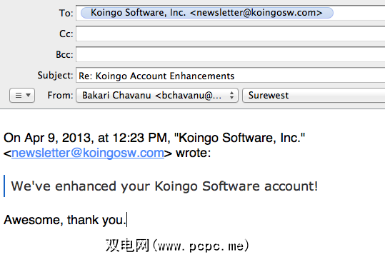 默认情况下,当引用发件人电子邮件中的文本时,邮件会将光标置于上方您回覆中的讯息;这称为“底部发布"。这很奇怪,因为通常您希望收件人先阅读要回复的邮件的哪一部分。插件QuoteFix(免费/捐赠)可通过在您回复或转发邮件时将光标置于原始邮件下方来解决此烦恼。