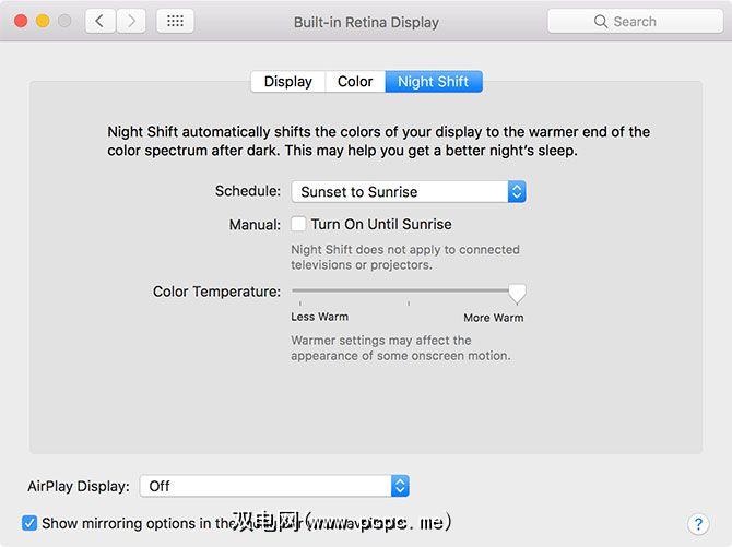 如果您设置此功能,效果会更好当您在选择的时间自动启用自身功能时,它会按计划运行。转到系统偏好设置>显示,然后单击夜班标签。在这里,您可以选择手动激活,日落到日出和自定义计划以适应您的习惯。