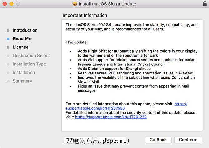 如果在App Store中看不到更新,则可以从Apple下载合并的10.12.4更新并安装使用PKG安装程序进行安装。这将使您可以从10.12.0起更新任何版本的macOS Sierra(因此,已合并)。