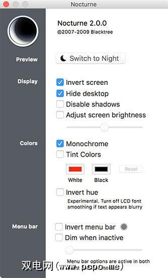 Nocturne对于在黑暗环境中工作的Mac用户来说是一个长期的解决方案。自2009年以来,该应用尚未进行过更新,但我们已经在macOS Sierra上对其进行了测试。该应用程序位于菜单栏中,并使用切换到夜晚按钮手动激活。