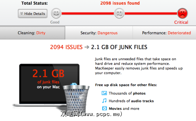 MacKeeper可以做很多事情。安装它时,它可能会抱怨您的系统“脏",“危险"和“恶化"。整个系统的状态可能会很“紧急"-至少对于我的MacBook来说,就是这样,它只有几个月的历史,并且使用量很少。