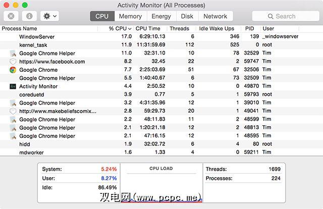 您是否曾经走进过房间,发现笔记本电脑无故地大声烹饪?通过选择启动活动监视器(使用Spotlight搜索或在应用程序>实用工具中找到它),可以找出导致MacBook Air加班的确切原因。 CPU 标签,然后单击 CPU 列按降序排序。