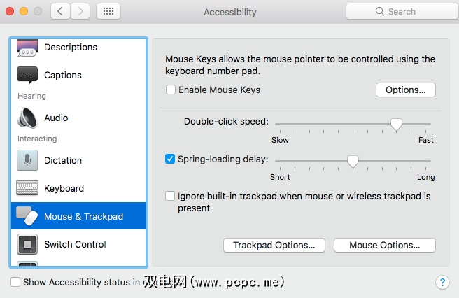 要确保未打开触控板,请使用 Apple>系统偏好设置>辅助功能>鼠标和触控板,以确保触控板没有打开。