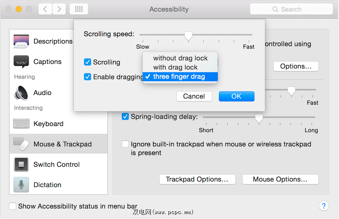 检查启用拖动设置。如果未启用,请单击它以选中该复选框。在此旁边的弹出菜单中,选择三指拖动。这是一个可访问性设置,使您可以使用触控板上的三个手指在屏幕上移动窗口。