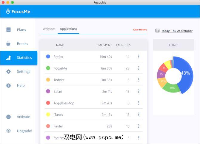 如果没有Catalina,您仍然可以使用第三方应用程序FocusMe来跟踪时间。此高级应用程序以饼图的形式显示Mac的使用情况,让您可以在需要时执行限制或安排停机时间。