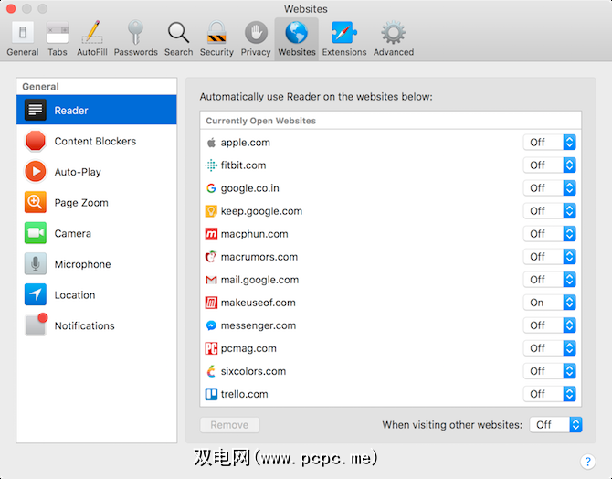 要全部打开所有网站,请转到首选项>网站>阅读器,然后从访问其他网站旁边的下拉菜单中,选择打开。