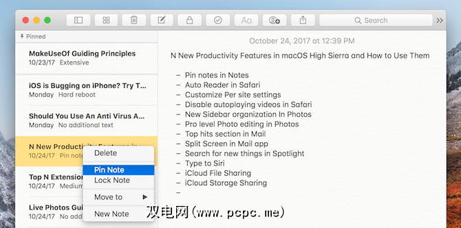 这就是为什么High Sierra中的Pin Notes功能提供了如此巨大的帮助的原因。您可以右键单击任何便笺,然后选择固定便笺。现在它将在列表的顶部(对于相关文件夹)。在任何时候,我都会积极处理两到三个笔记。 Pin Notes功能使我很容易跟踪它们。