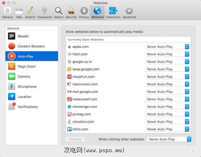 要关闭所有网站的自动播放视频,请转到首选项>网站>自动播放,然后从在“访问其他网站时"部分,选择从不自动播放。