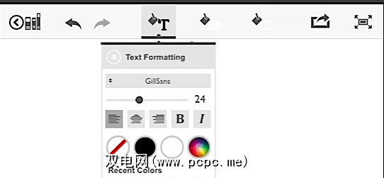 该应用程序使用三个工具栏,顶部的工具栏包括用于撤消和重做,文本和颜色格式,内容的导出和导入以及隐藏工具栏的全屏模式的按钮。