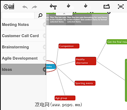 底部工具栏由页面选择器组成,该页面选择器除了创建新的空白页面外,还包含会议记录,客户电话卡,集思广益的模板(包括用于预格式化轮廓的模板,SWOT分析图和思维导图集群)和想法。