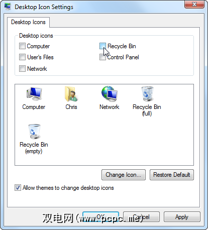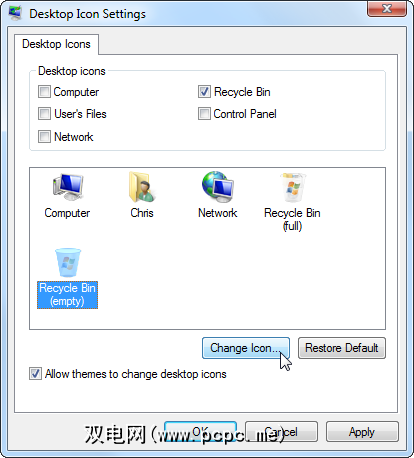 要在以后撤消更改,请选择该图标,然后使用“恢复默认值"按钮。请注意,如果您在Windows中选择其他主题,回收站图标将发生更改–为防止这种情况发生,请在此处取消选中允许主题更改桌面图标选项。