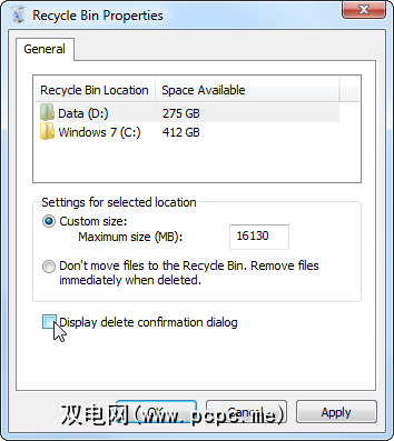 您是否不喜欢每次删除文件时出现的“ 确定要将此文件移到回收站?"消息?我愿意(但也许我只是不耐烦)。要禁用确认消息,请右键单击桌面上的“回收站"图标,然后选择属性。取消选中显示删除确认对话框选项。