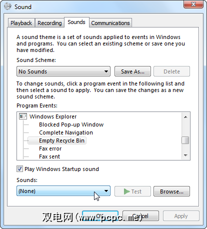 在Windows资源管理器下选择空回收站声音,然后选择您喜欢的声音。您可以从Windows包含的声音中选择一种,也可以浏览到自己的声音文件。您还可以更改整个声音方案,以选择Windows首选的声音集,或完全禁用所有声音。