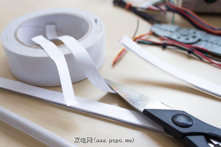 将电视从墙上拉开或转动它周围,并测量。我假设您将这些胶条直接粘贴到电视上,但是如果不是这种情况,则需要构建一个框架。尝试确保直接在每个角上得到一个像素,否则此步骤应该很容易。继续,将条带切割成较短的长度–仅在虚线指示的铜焊盘之间切割;并在每个长度上粘贴3M双面胶带。