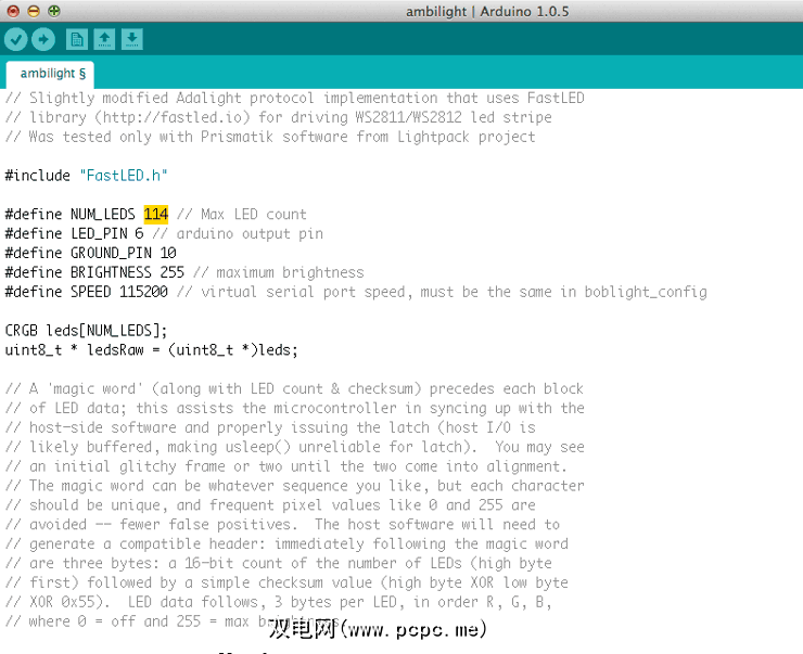 这是项目中最繁琐的部分–每个单独的LED必须在软件中定义。在“处理"中加载 Adalight.pde ,然后首先更改定义沿边和顶部的像素数量的变量(暂时忽略任何丢失的像素)–这是第87行。在顶部和底部使用了35个像素,在侧面使用了22个像素,因此将其定义为 {0,35,22} 。