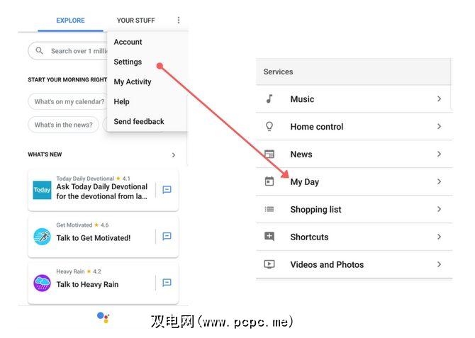 其中的内置功能之一是My Day新闻简报。通过点击Google助手面板右上角的三点图标来访问它。然后,选择设置,并向下滚动到服务子标签下的我的日子。该功能使您可以获取每日的自定义信息。