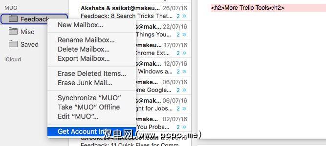 要从Mail应用程序中的文件夹取消订阅,请先右键单击边栏,然后选择获取帐户信息。这会将您带到帐户信息>订阅列表,您可以从其中取消订阅选定的文件夹。